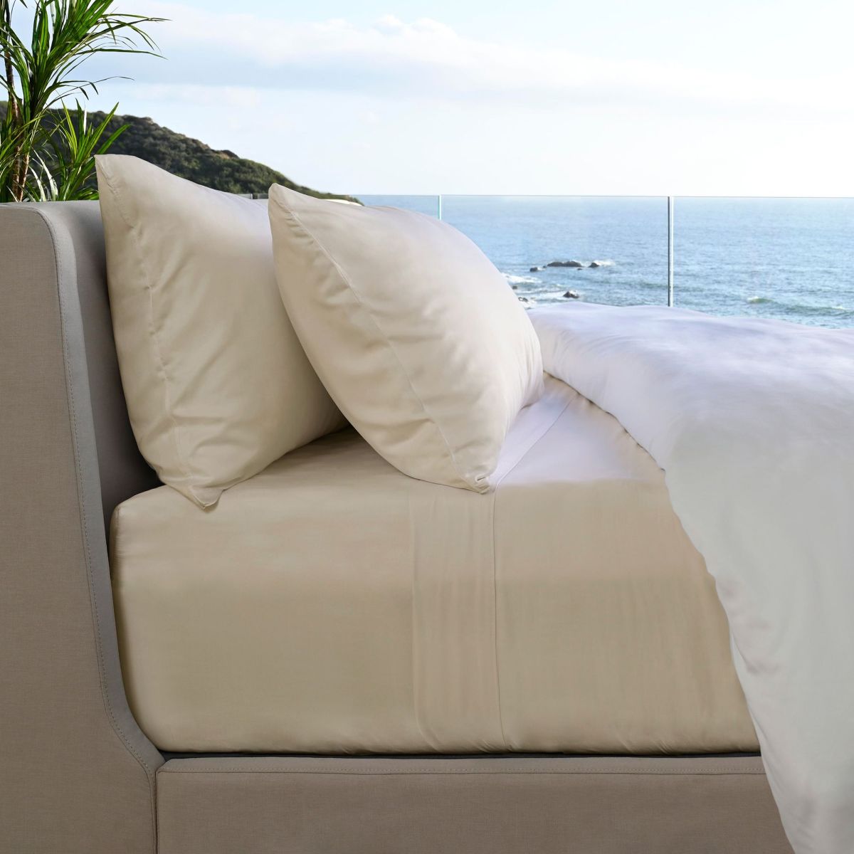 Experience the comfort and quality of a beach resort in your own home with our Resort Bed Sheets made from soft and sustainable bamboo viscose. These sheets feature a premium sateen finish and advanced box-stitch seams, providing comfort and craftsmanship that you can depend on sleep after dreamy sleep. Our bamboo-viscose fabric naturally regulates sleep temperatures, letting you sleep cooler in the summer and warmer in the winter. It also repels odors and allergens naturally without any harmful chemicals, so you can wake up each morning feeling fresh and clean. Start sleeping, living, and feeling every day like you do on vacation with these luxuriously soft bed sheets. Also, at no risk to you, enjoy free shipping anywhere in the contiguous U.S.