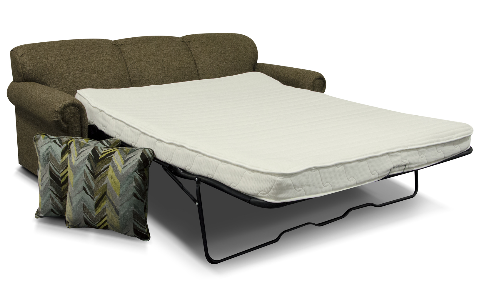Entertain your overnight guests in style with this traditional/transitional sofa sleeper. Available with a twin, full or queen size mattress, this sleeper offers the best of both worlds. Impressive sofa by day, a comfortable extra bed by night. Three over three seating configuration comes in your choice of covers including solids and floral. Toss pillows can be matching or contrasting. The Custom Comfort innerspring mattress and sleeper mechanism both carry a five year limited lifetime Warranty. A sleeping option you will be proud to offer your guests. Available with your choice of standard, air, or Visco sleeper mattress.