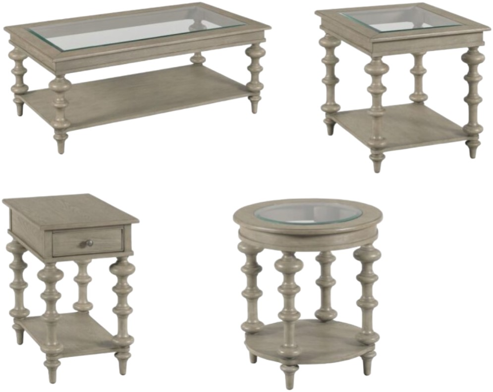 Set includes cocktail table, end table, chairside table, and round table