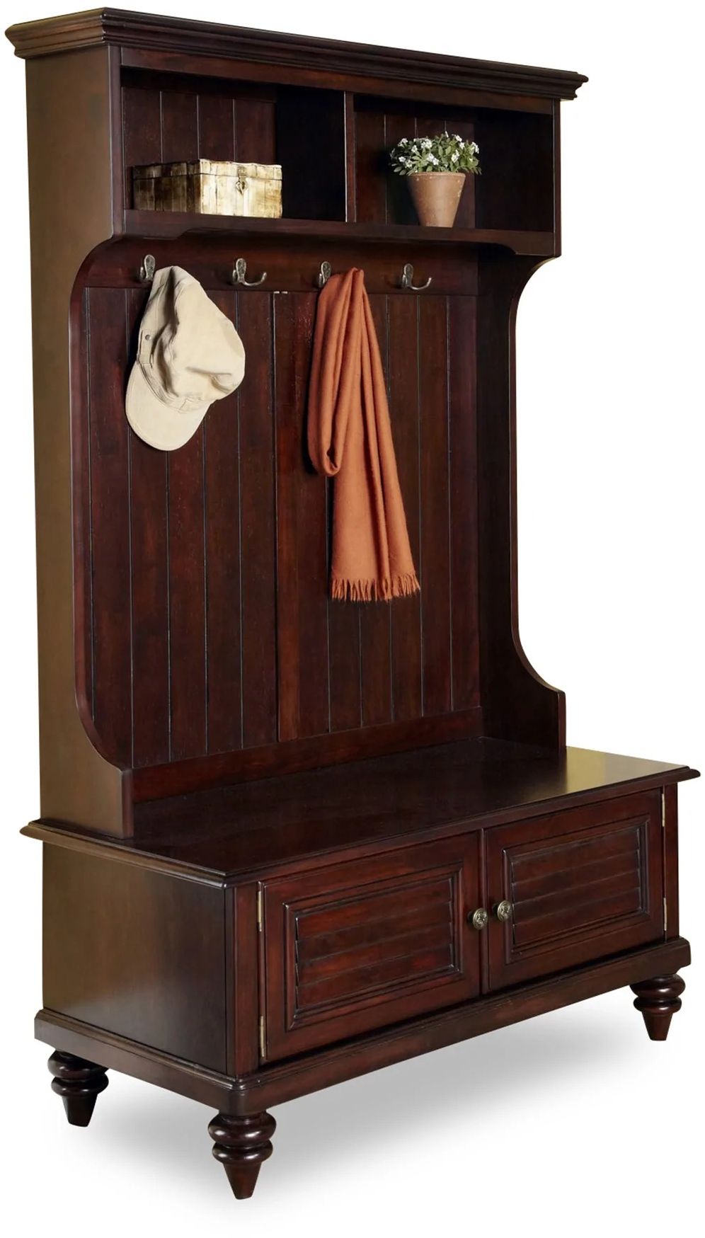 Inspired by the fusion of British traditional and old world tropical design, the Bermuda Hall Tree by homestyles is constructed of rubber wood solids and veneers in a deep espresso finish. Further inspiration can be found in the shutter doors and turned feet. Provides abundant storage space, with two shutter doors that open to a storage compartment and two pigeonhole open storage areas at the top. Four decorative coat hooks and antique brass hardware complete the design. Assembly required.