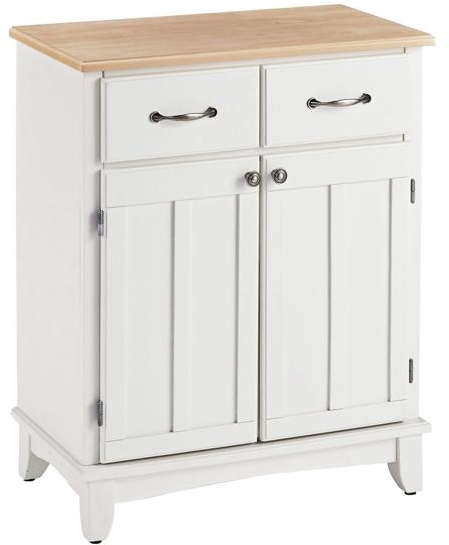 Small Server with Wood Top by homestyles is constructed of hardwood and wood products in a white finish with a natural wood top. Features include two utility drawers, two wood framed cabinet doors with an adjustable shelf for plenty of inside storage, and brushed steel hardware.