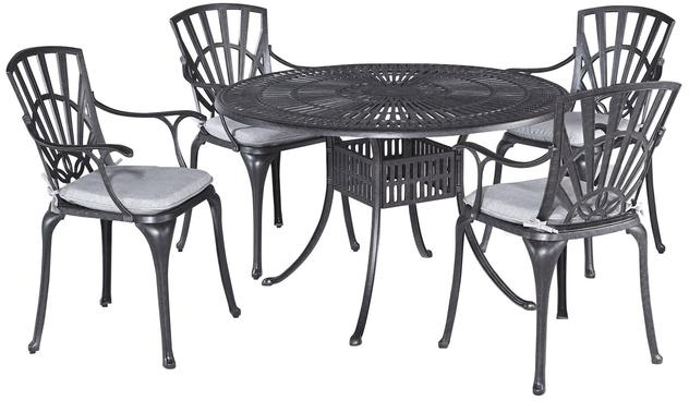 This 5-piece dining group includes a 48"D table and four arm chairs with cushions to bring any small group closer together. The table and chairs feature a UV-resistant cast aluminum frame, with a hand-applied powder-coated finish that is sealed with a clear coat for completely worry-free maintenance.Read More