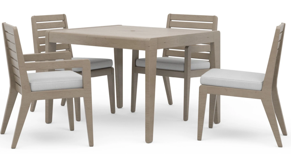 The water-resistant cushions and gray acacia wood with a UV-resistant finish deliver solid performance year after year.