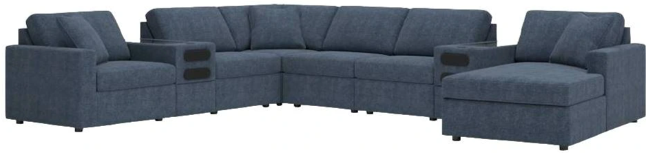 Includes 8 modular pieces: left-arm facing corner chair, 2 audio consoles with storage, wedge, 3 armless chairs and right-arm facing corner chaise